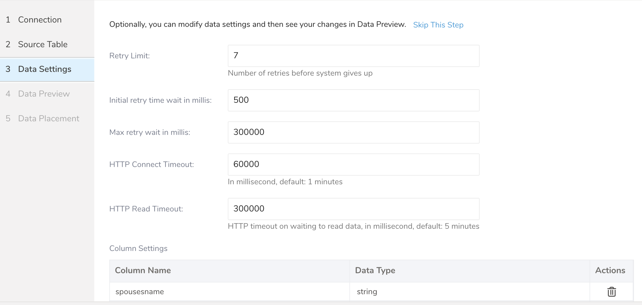 | Skip Invalid Data? | When a column data type can not convert to a known value, the row will be skipped. If more than 30% of processed rows are invalid, the job stops with a status of fail. | No |