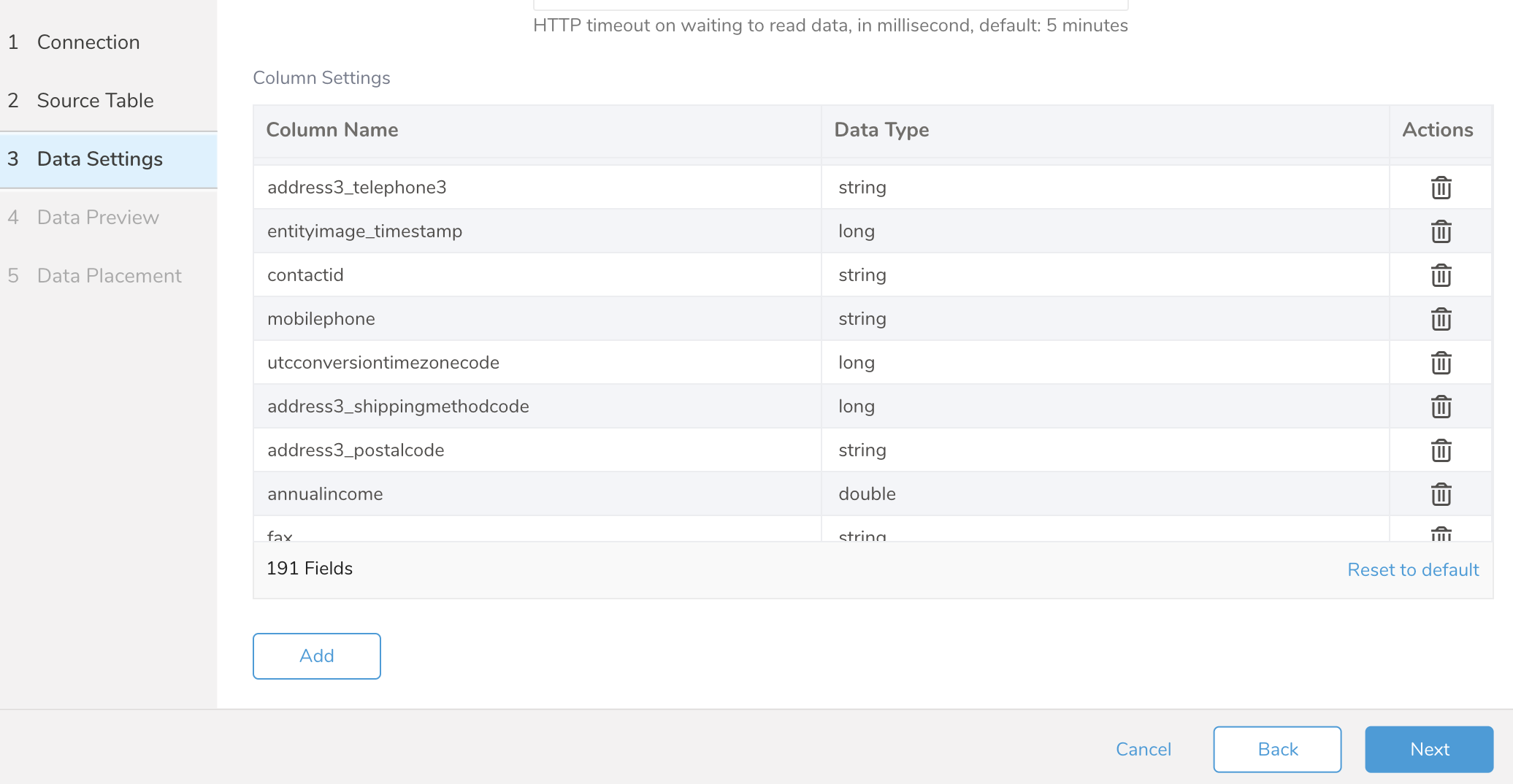 | Column Settings | You can remove a column from the result or define its data type. Do not update the column name because it results in a null value for that column. | No |