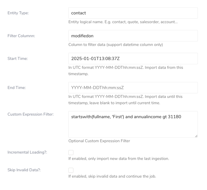 | Custom Expression Filter | - A text area where you can enter custom filter expressions to refine your data import - This filter will be combined with the time-based filter using AND operator - Leave empty if you only need time-based filtering - Please refer the the section "Building Custom Filter Expressions" below for more details on how to formulate the custom filter expression | |