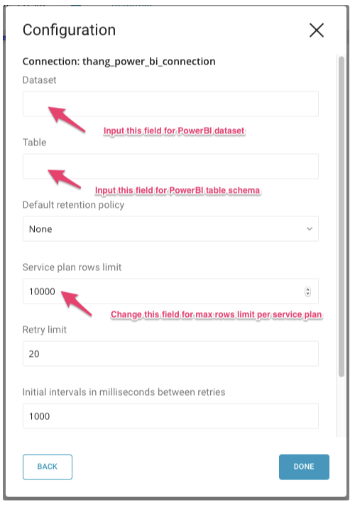 Max rows are added per hour per dataset for service plans. The free service plan allows 10,000 rows. The paid service plan allows 1,000,000 rows. 12. Select Done.