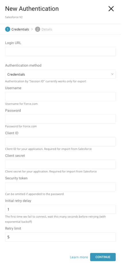 In the dialog box, enter the values that you enter in your legacy Salesforce connector.