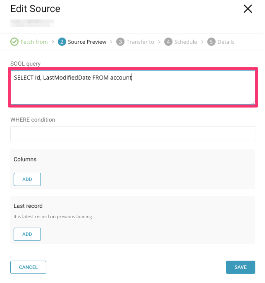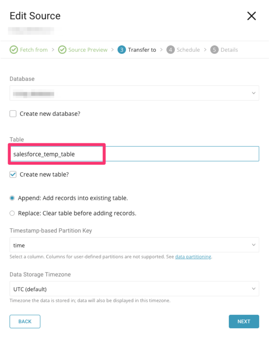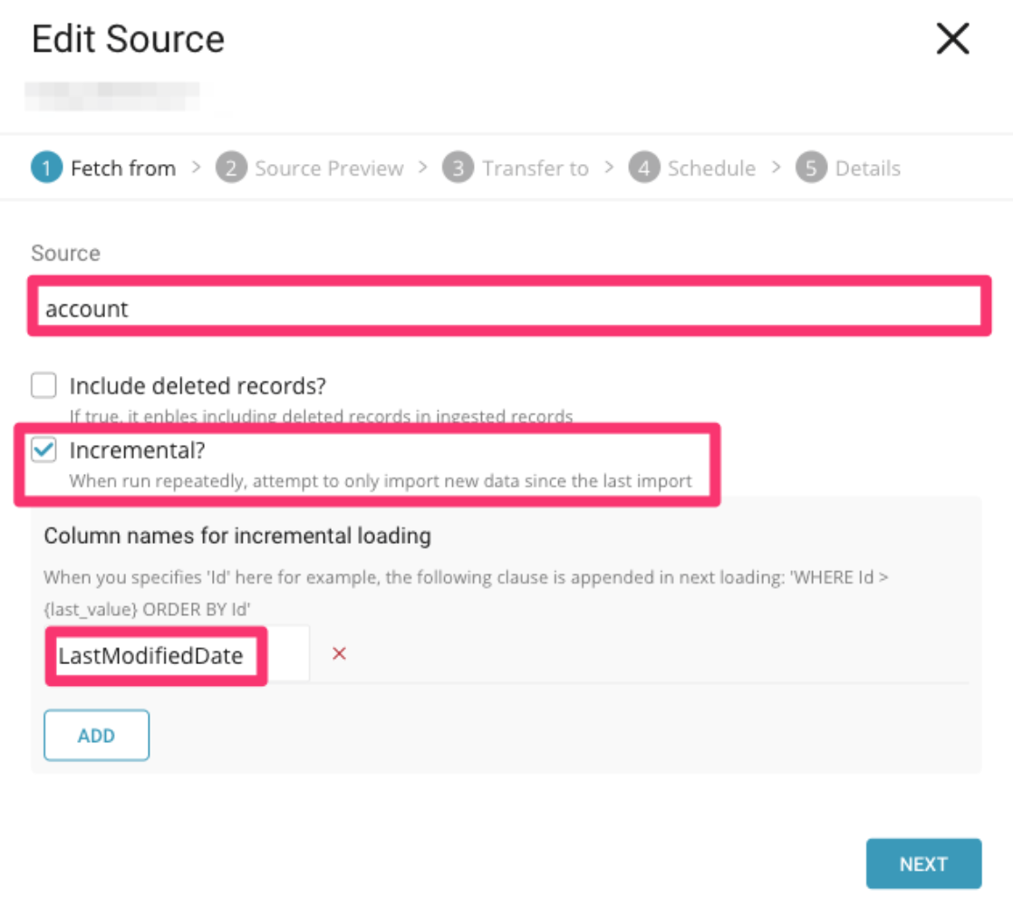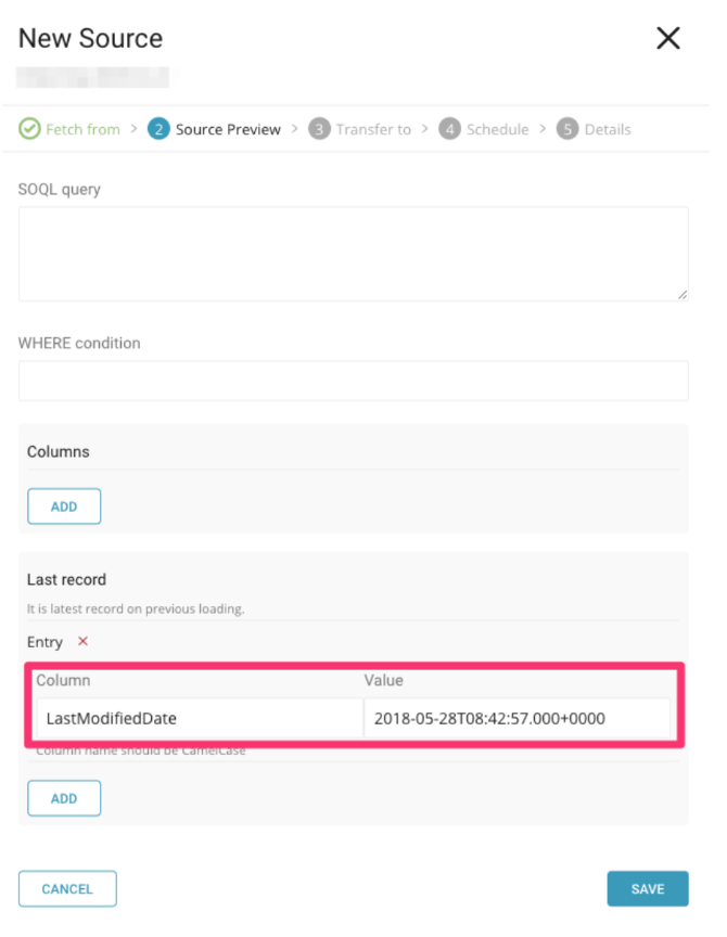 Select the New Source. Fill in all basic settings and advanced settings that you copied in the preceding steps. Then, if you want the new source to continue ingesting from the point where the legacy connector left, fill in the Last Record field with the config_diff information that you copied in the previous job.