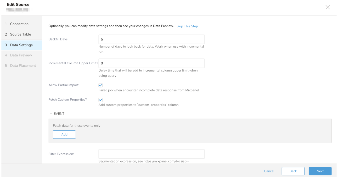 | Backfill Days | The amount of time that will be subtracted from from\_date to calculate the final from\_date that is used for the API Request. This is due to the Mixpanel caching data on user devices before sending it to the Mixpanel server. It only affects when Incremental is true and Incremental Field is specified. The default value is 5 |