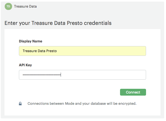 Connect to Treasure Data from Mode. Click your profile icon button on the menu, and click Connect a Database menu.