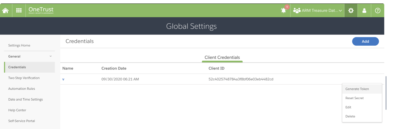 Create a OneTrust token to store the Client ID and Secret. This is short-lived token.