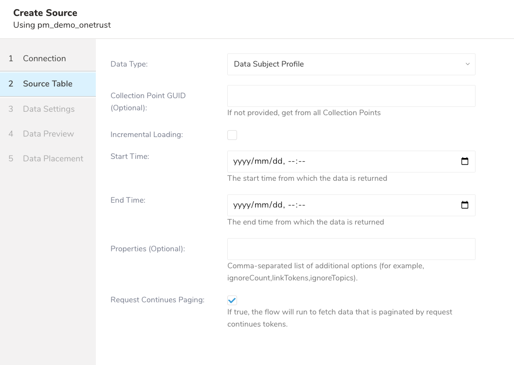 start_time | For UI configuration, you can pick the date and time from supported browser, or input the date that suit the browser expectation of date time. For example, on Chrome, you will have a calendar to select Year, Month, Day, Hour, and Minute; on Safari, you need to input the text such as For cli configuration, we need a timestamp in RFC3339 UTC "Zulu" format, accurate to nanoseconds, for example: | TimeStamp. | Yes when select Incremental Loading. No for every the API V1 Data Type (data_subject_apiand collection_point). Yes for every API V4 Data Type. (data_subject_profile_v4, link_token_api_v4 and purpose_api_v4). | |