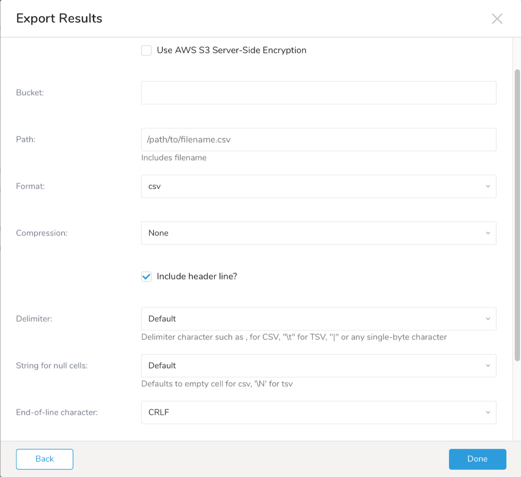 - Define any additional Export Results details. In your export integration content, review the integration parameters. For example, your Export Results screen might be different, or you might not have additional details to fill out: