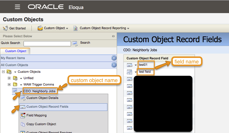 - If the Eloqua server's custom object or account field name contains a space, replace it with an underscore in your query.