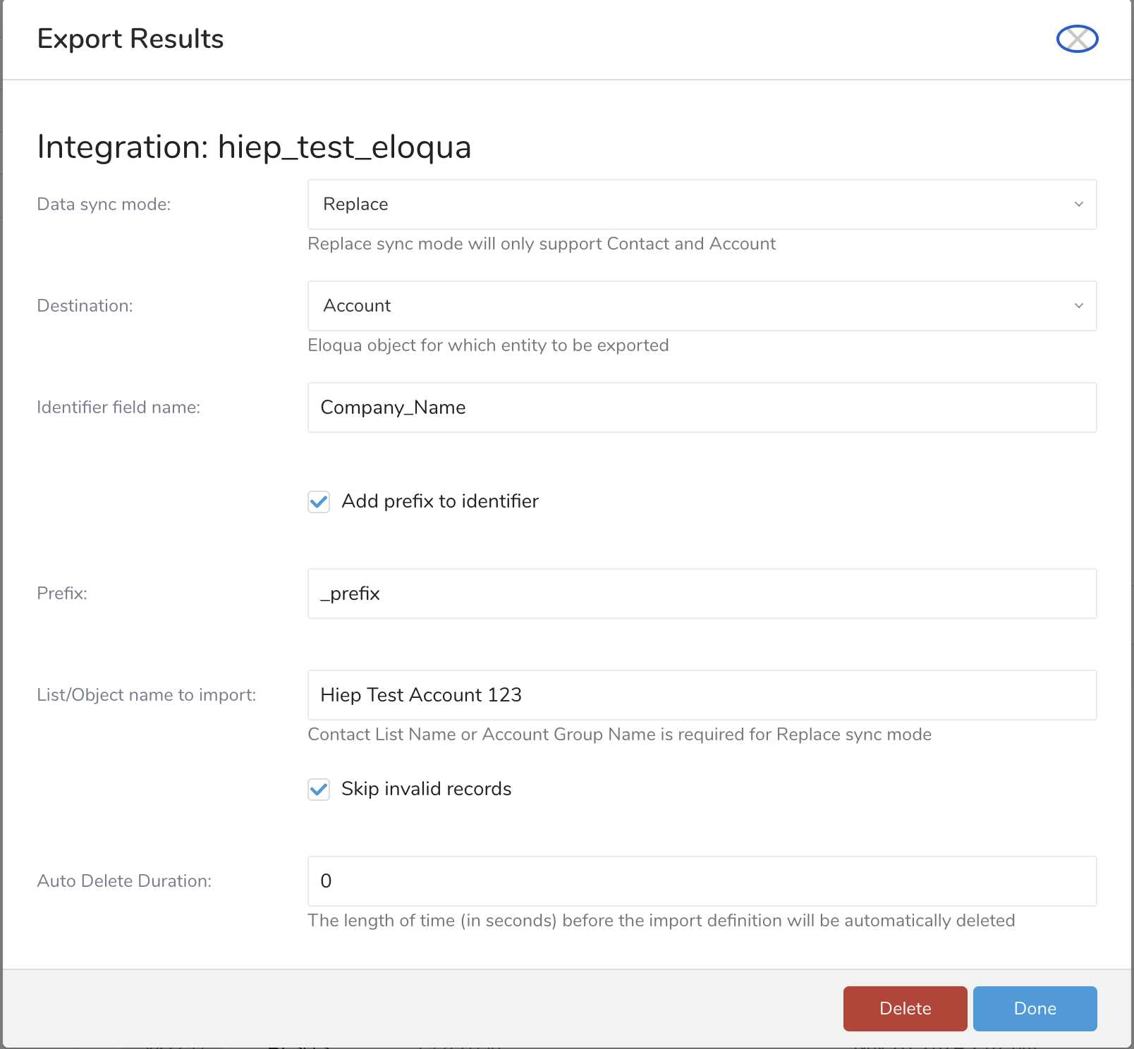 | Data sync mode | Append or Replace | The Eloqua action to export data (Append or Replace) |