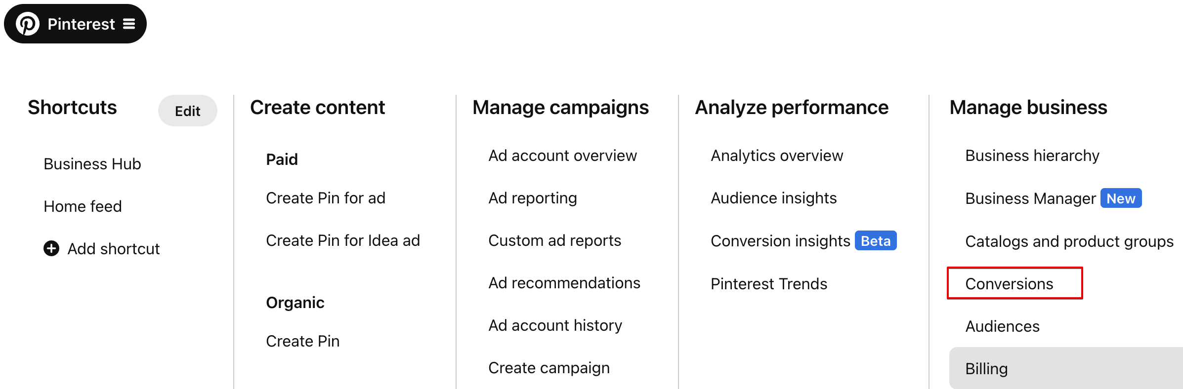 From the Pinterest Ad Manager, navigate to the main menu, and select Conversions.