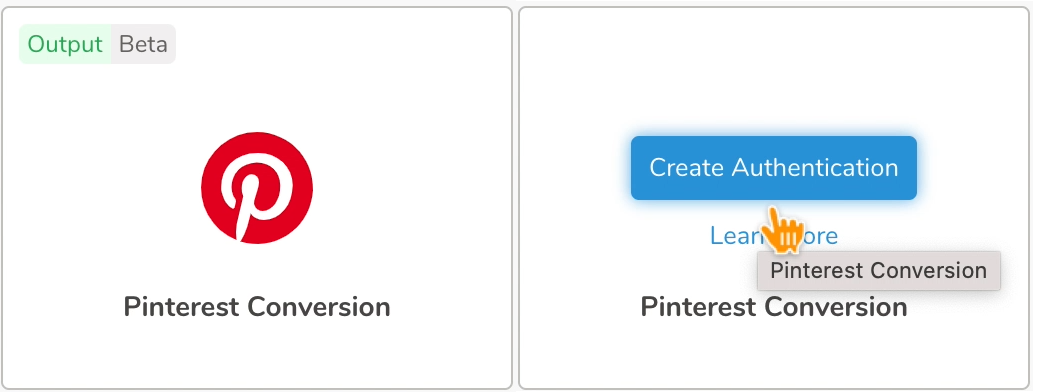 - Select an existing Pinterest Conversion authentication or create a new one (see Create a New Connection).