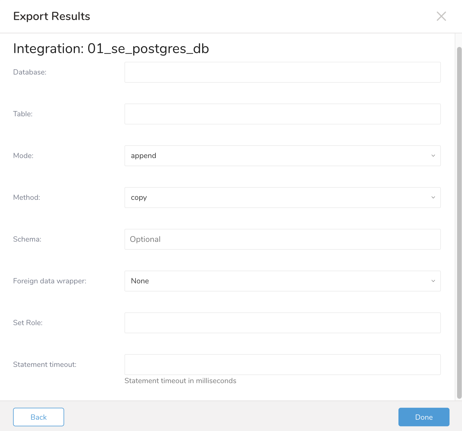 - Define any additional Export Results details. In your export integration content review the integration parameters. For example, your Export Results screen might be different, or you might not have additional details to fill out: