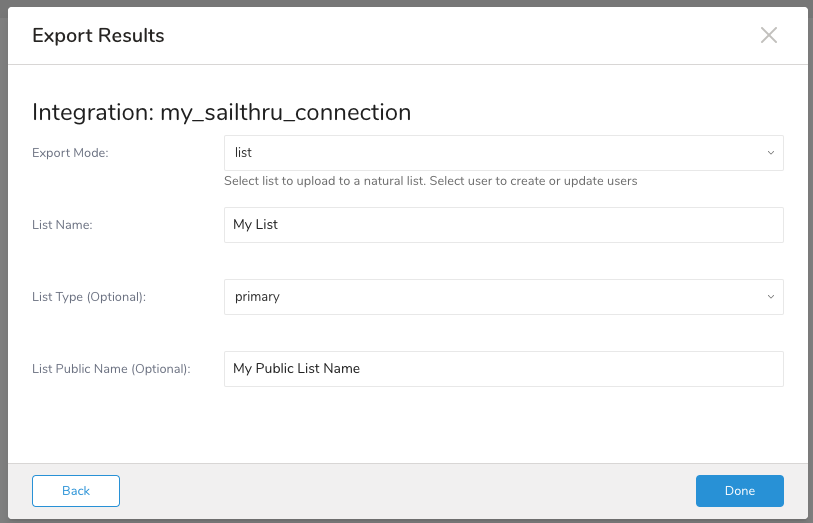 Similar to User Mode, Bulk User mode creates new and updates existing users, allowing the export of more information for the user type. The major difference is that it won’t trigger Lifecycle events. Submissions to Sailthru API are done in the same manner with List Mode, by asynchronous bulk jobs.