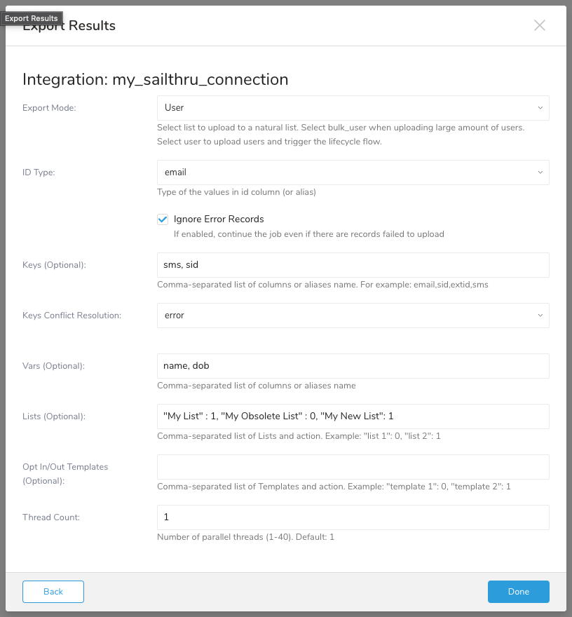 idcolumn --email, sms, sid, extid.Optionally, If Ignore Error Records selected, export jobs will still proceed even if a user cannot be created/updated. If left unchecked, TreasureData-side jobs terminate if an error record occurs. Submitted (Sailthru-side) jobs cannot rollback. Notes that unlike User export mode, “Ignore Error Records” is meant only for some client-side validation (for example, the malformed syntax of Lists or Vars). Other kinds of invalid records will be automatically ignored in Sailthru’s jobs by default.