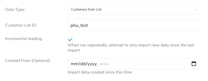 Incremental loading is available for many of the Treasure Data integrations. In some cases, it is a simple checkbox choice; in others, after you select incremental loading, you are provided with other fields that must be specified.