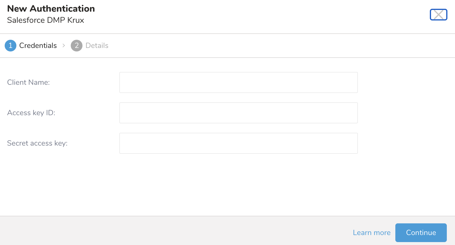 Edit the client name (e.g. client-treasure-data), access key id, and secret access key that you retrieved from Salesforce DMP.