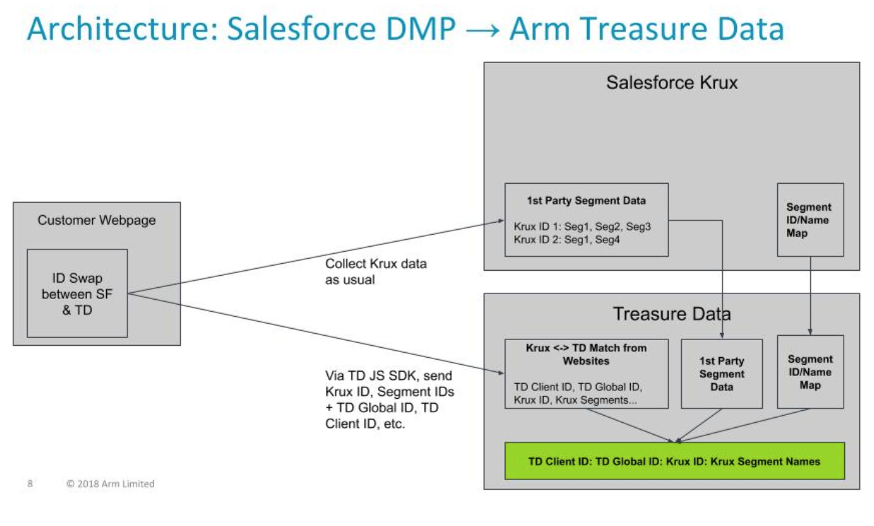 - Data import from Salesforce DMP into Treasure Data CDP: There are various data feeds that can be brought in. For the purpose of data enrichment, the key file is the mapping between Segment IDs and their names.