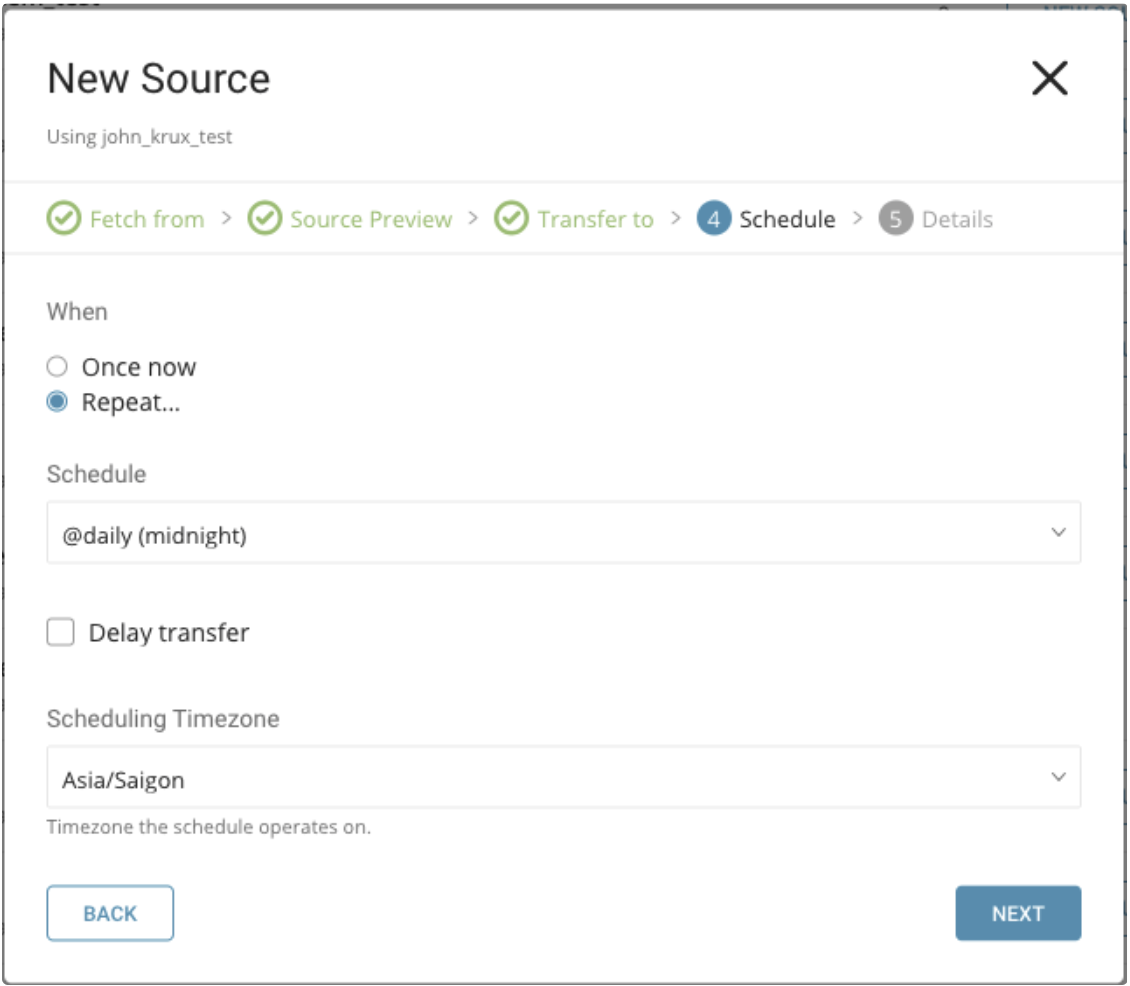 A new schedule can be created using the td connector:create command. The name of the schedule, cron-style schedule, the database and table where their data will be stored, and the data connector configuration file are required.