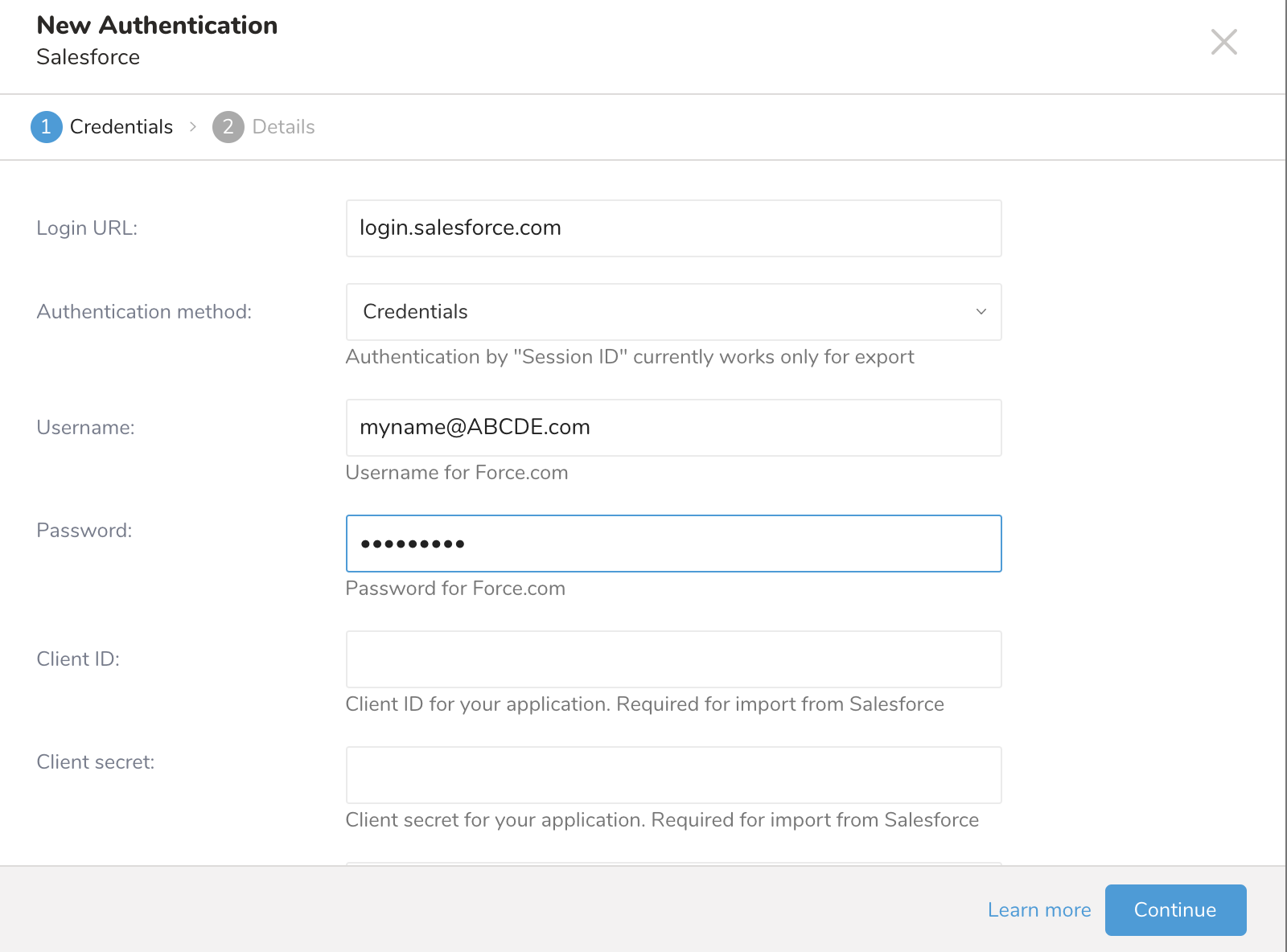 - To authenticate with your credentials, enter your username (email) and password and your Client ID, Client Secret, and Security Token.