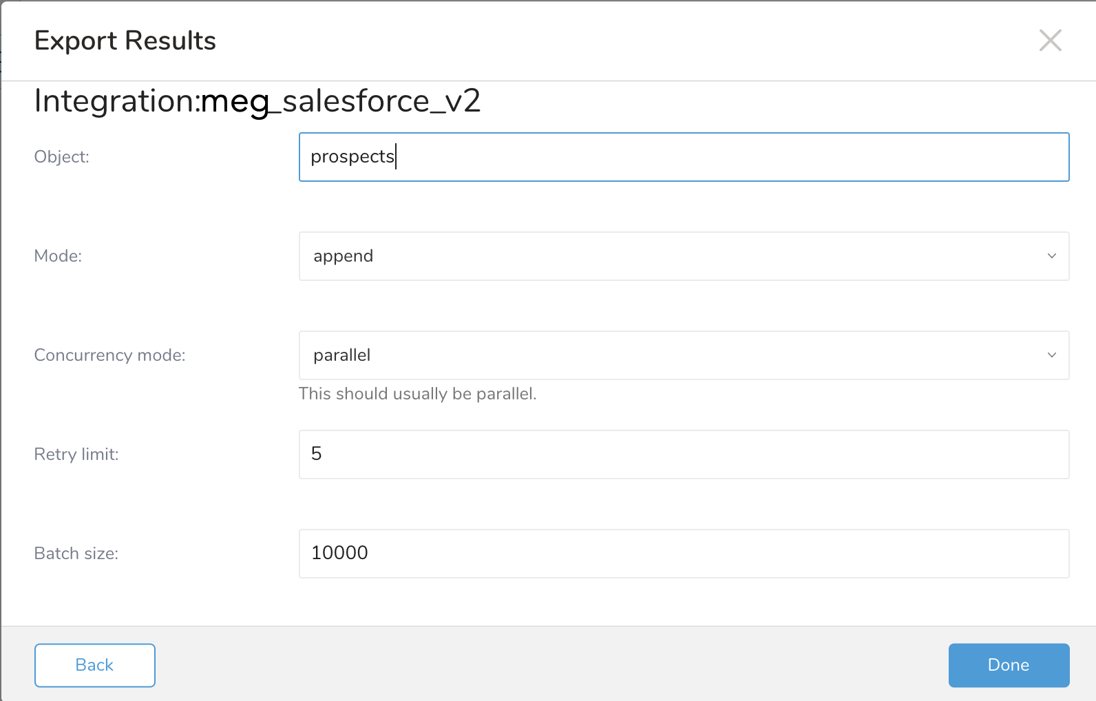 | Batch size | Splits the records in the result of a query in chunks of 10000 records by default and bulk uploads one chunk at a time. |