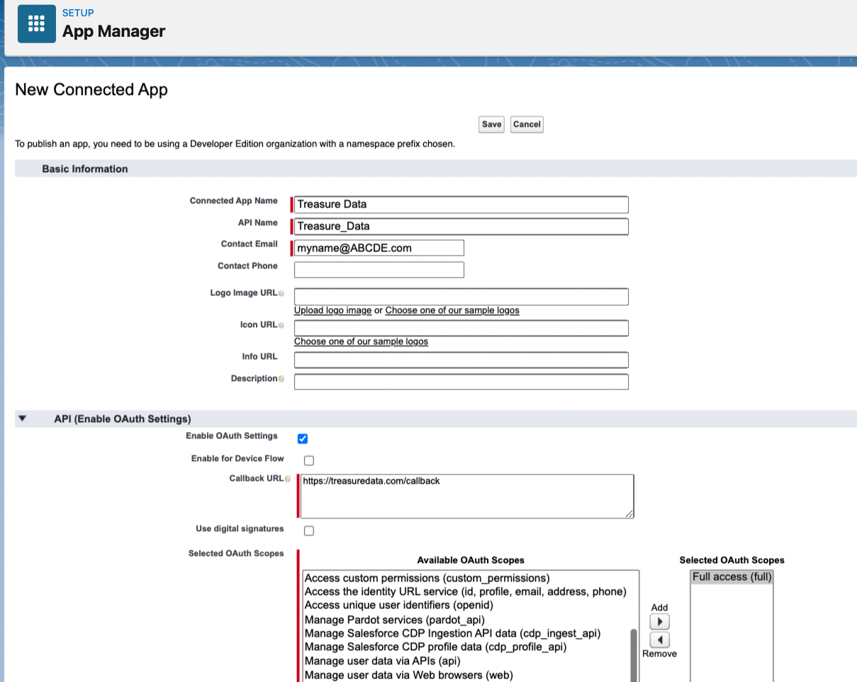 - Set some values and check Enable OAuth Settings. Then, grant OAuth permission scope.