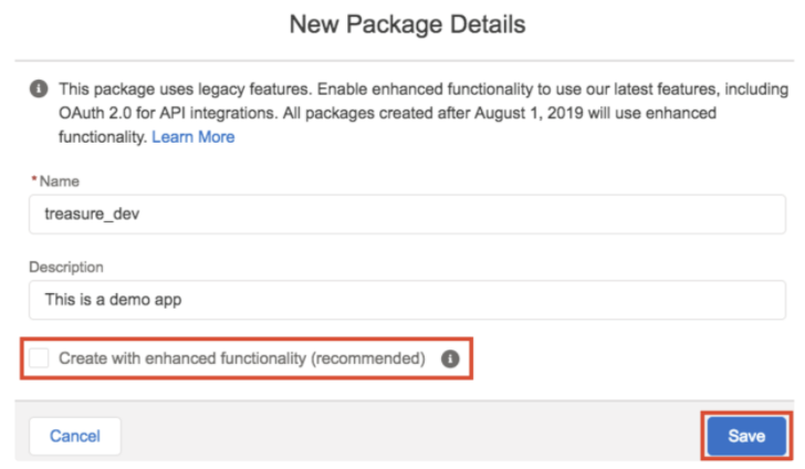 5. In New Package Details, enter the Name and Description. Clear Create with enhanced functionality (recommended). 6. Select Save.