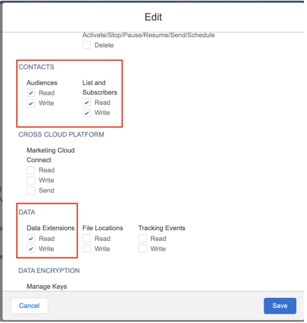 9. On the Add API Integration screen, scroll to Contacts > Audiences and to Contacts > List and Subscribers. 10. Select Read and Write under both in order to use Replace Audience feature. 11. Scroll down to the Data > Data Extensions. 12. Select Read and Write. You need these permissions to write data to Salesforce Marketing Cloud. 13. Select Save.