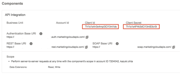 14. On the Installed Packages screen, scroll down to the Components panel. Copy down the Client Id and Client Secret. You use that information to write the data from Treasure Data to Salesforce Marketing Cloud.
