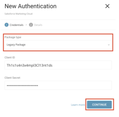 In the New Authentication dialog, select Legacy Package, then enter the Client Id and Client Secret (which you obtained when you created legacy package in SFMC). Select Continue.