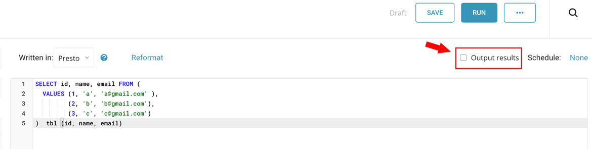 "SELECT id, name, email FROM (\ VALUES (1,'a','a@gmail.com’),\ (2,'b','b@gmail.com’),\ (3,'c','c@gmail.com’)\ ) tbl (id, name, email)" \