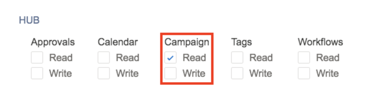 - Scroll to HUB section and select the Read checkbox on the Campaign