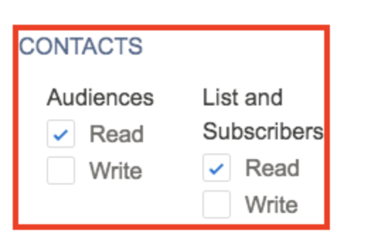 - Scroll to the CONTACT section and select the Read checkbox on Audiences and List and Subscribers
