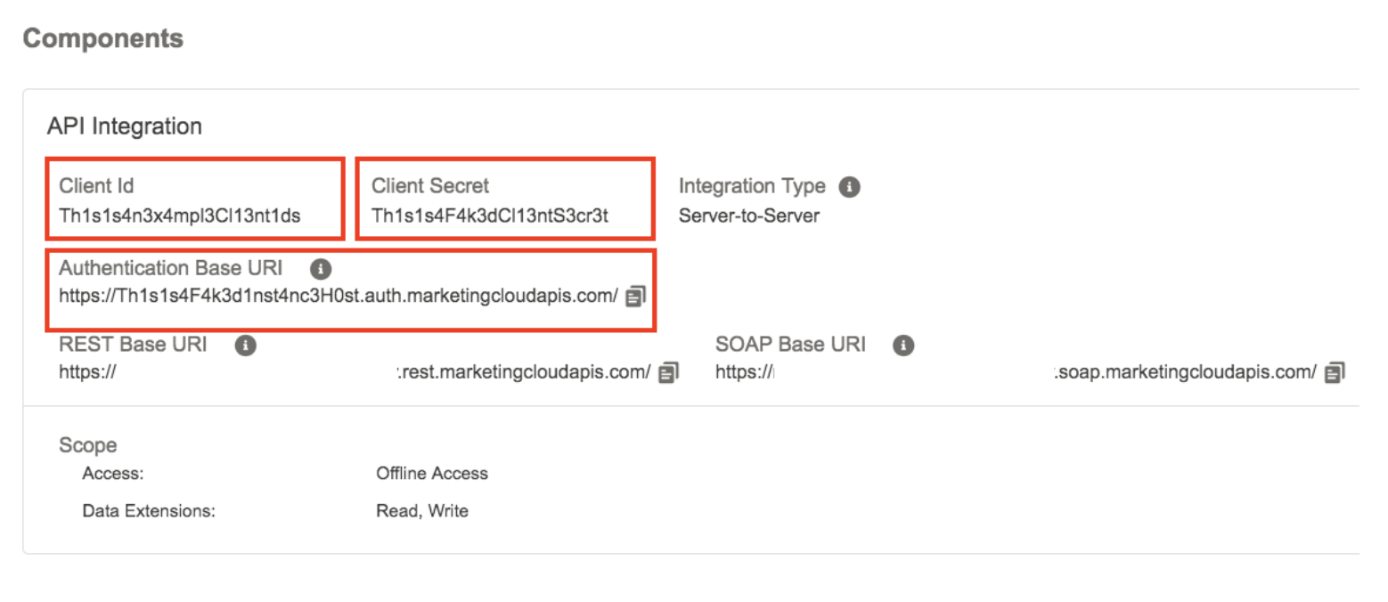 On the Installed Packages screen, scroll down to the Components panel, then take note of the Client Id, Client Secret and Authentication Base URI. You will use the information to write the data from Treasure Data to Salesforce Marketing Cloud.