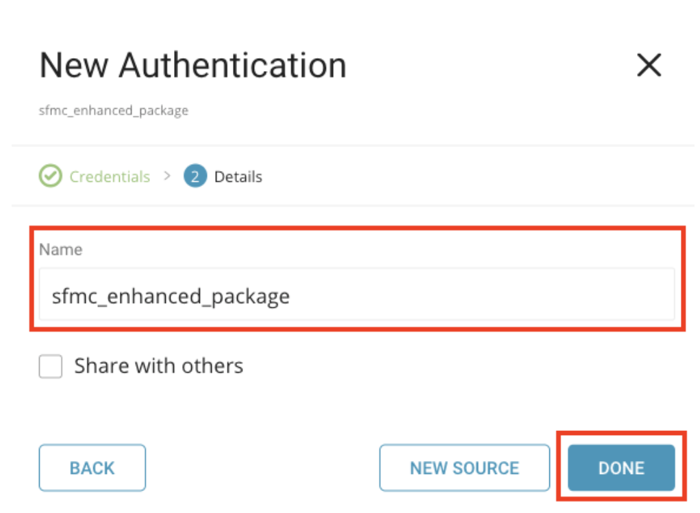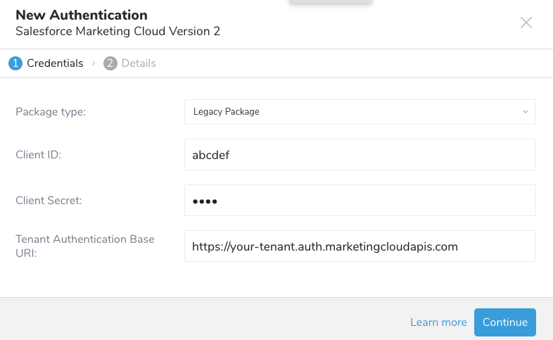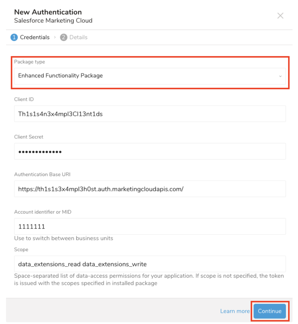 On the New Authentication screen, select Package Type as Enhanced Functionality Package, then enter the Client Id, Client Secret, and Authentication Base URI (which you obtained when you created the enhanced package in SFMC). Optionally, you could specify Account identifier or MID to access multiple BUs (more detail in How to get MID) and Scope to limit the token's scope (more detail in API scopes). Select Continue.