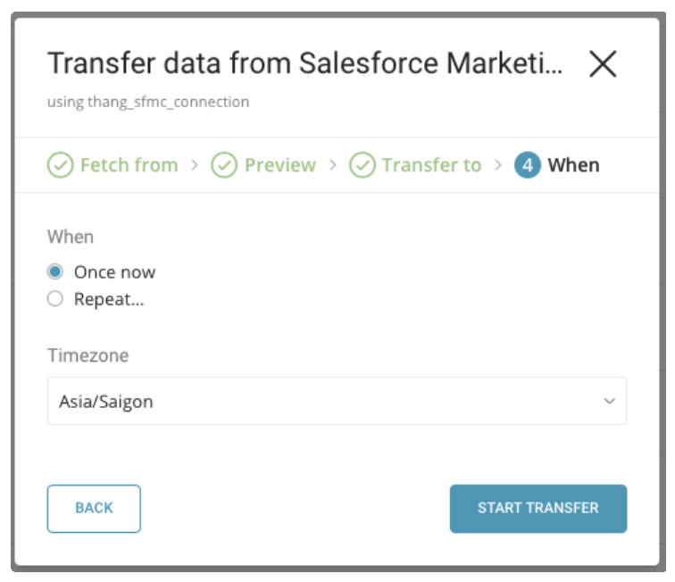 Specify the schedule of the data transfer using the following dialog and select Start Transfer: