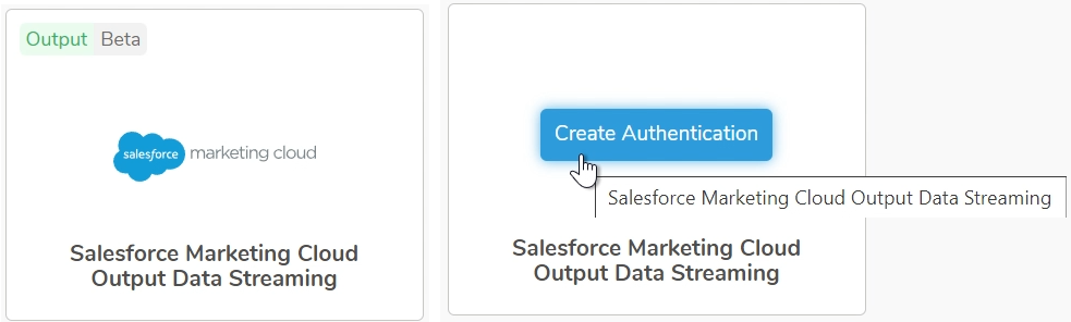 - Hover over the Salesforce Marketing Cloud Output Data Streaming connector and select Create Authentication.