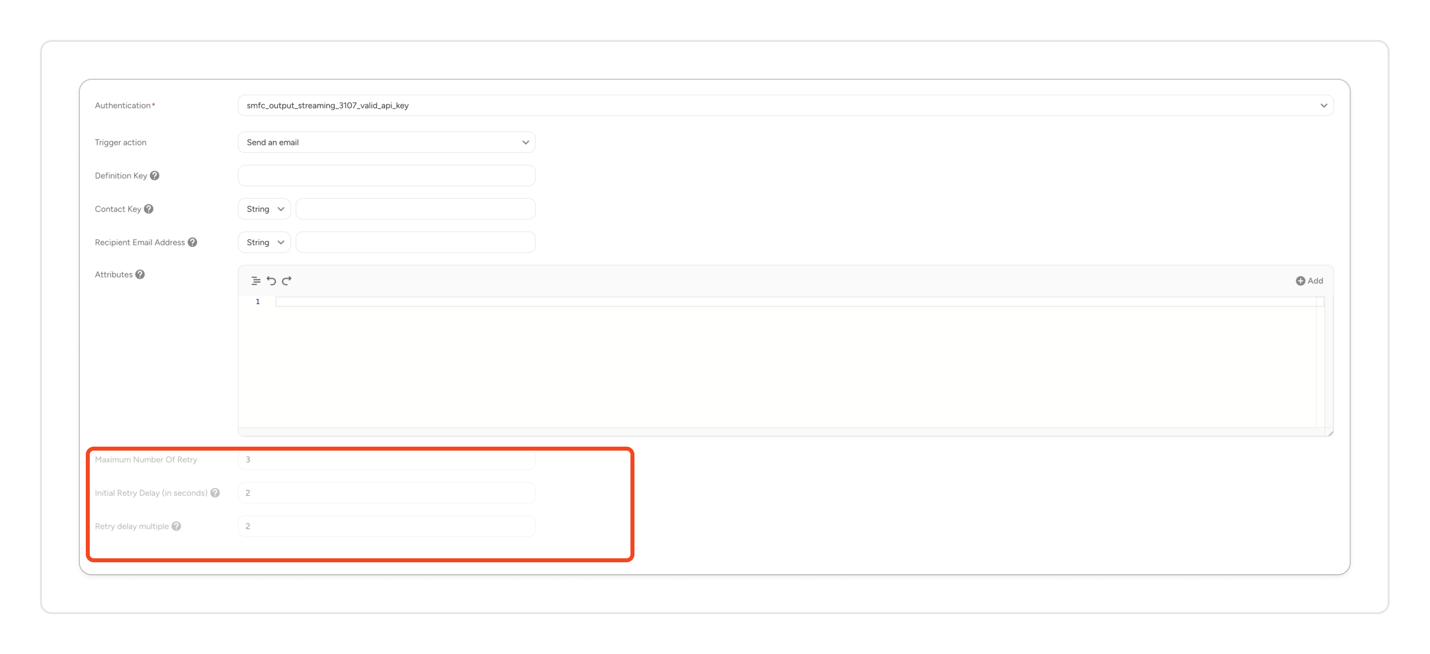 - The connector will retry to send the request when it gets the status code 429, 500, 502, 503, or 504.