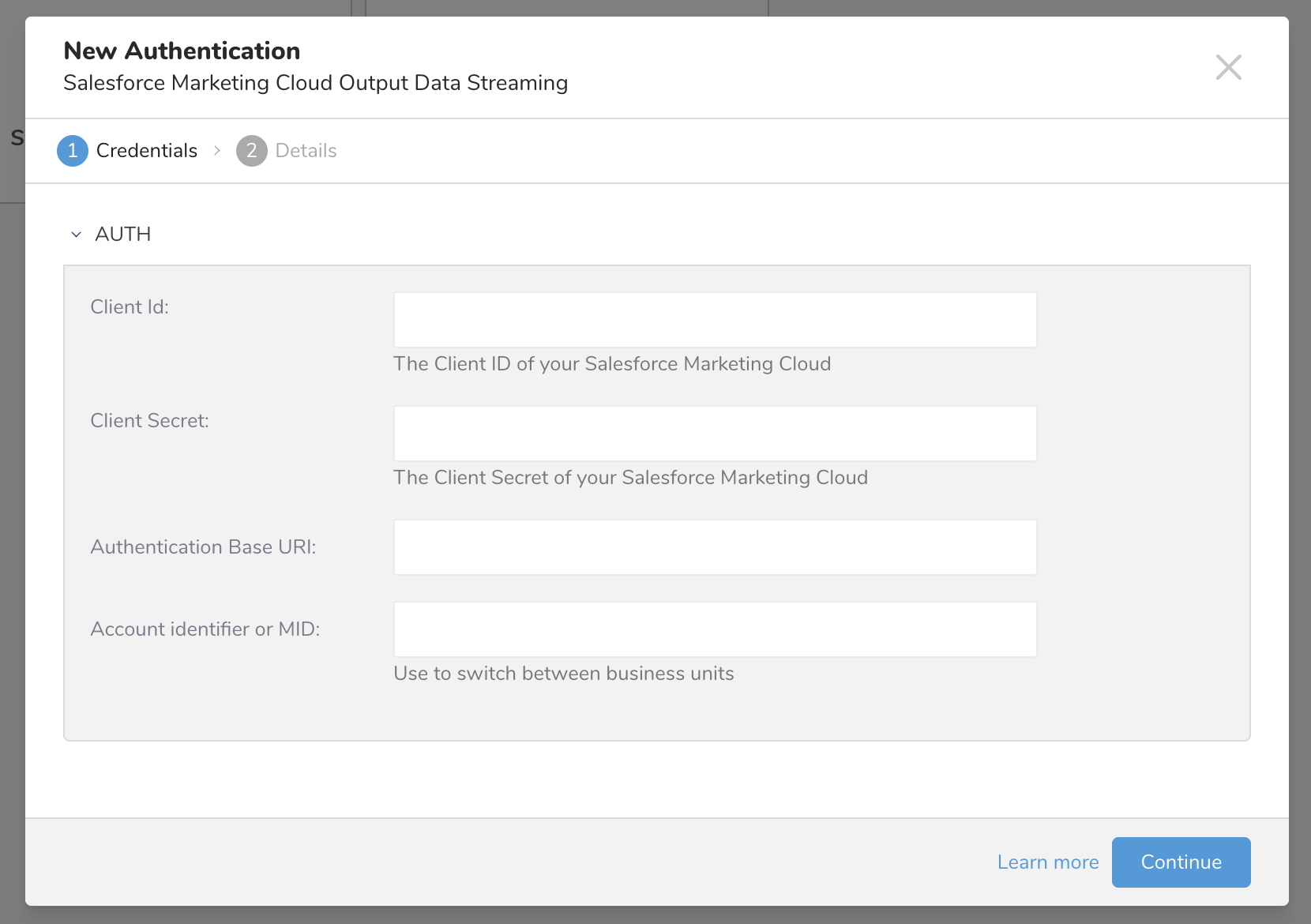 - Create an authentication for this integration to communicate with Salesforce Marketing Cloud.