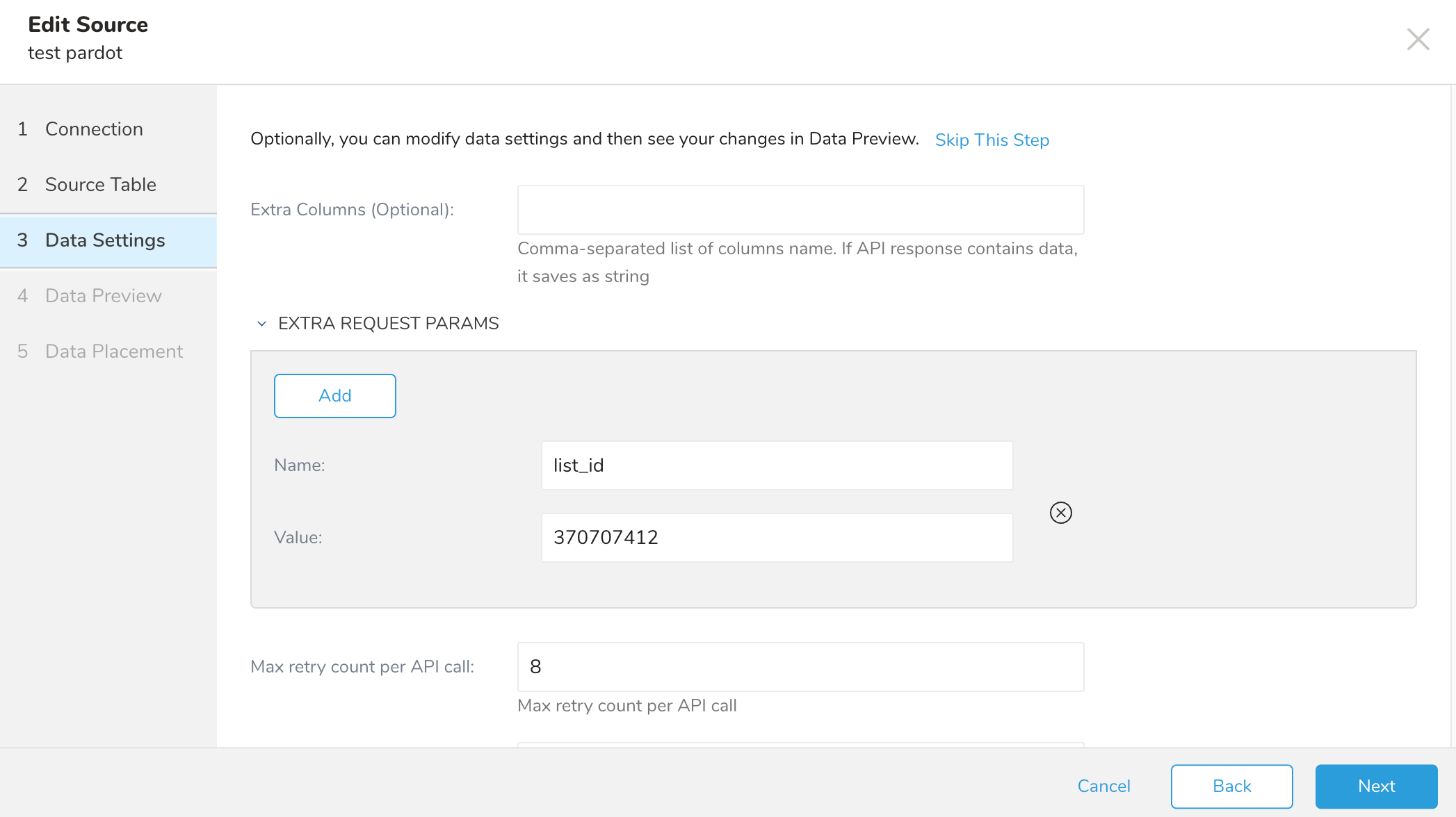 The Data Settings allows you to fine-tune the HTTP request to Salesforce Pardot. Update your designed config settings and select Next.