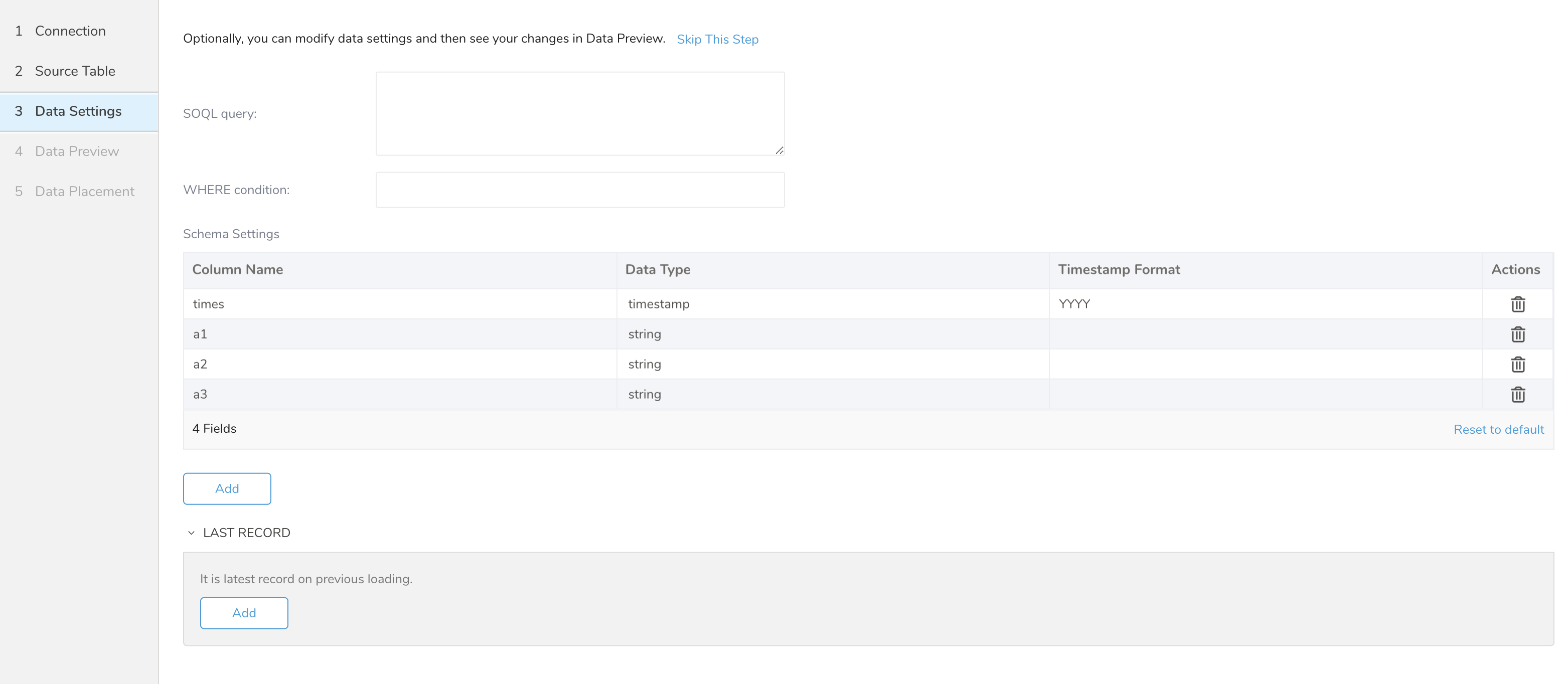 You can edit the SOQL query, WHERE conditions and Schema settings here.