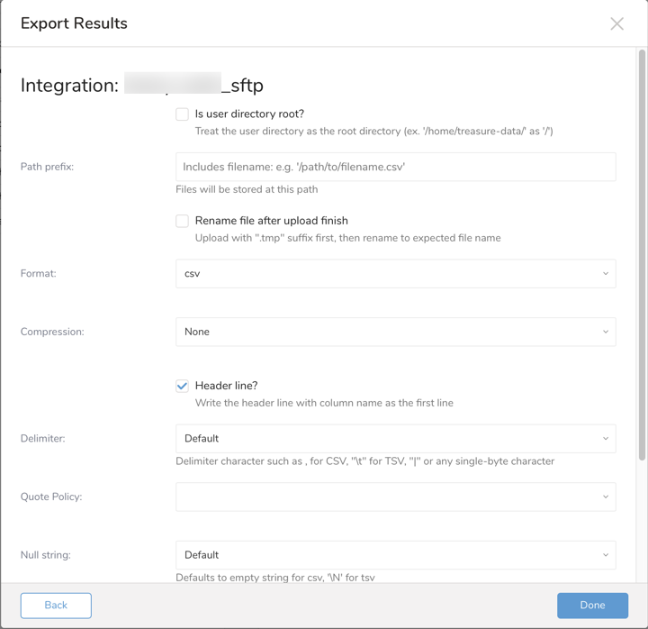 | Rename file after upload finish | If selected, SFTP result output renames the file on the remote SFTP server from .xxx.tmp to .xxx after all the data is transferred. Some MA tools try to import data when a file with a specific name exists on the SFTP server. The temp name option is useful for such cases. |