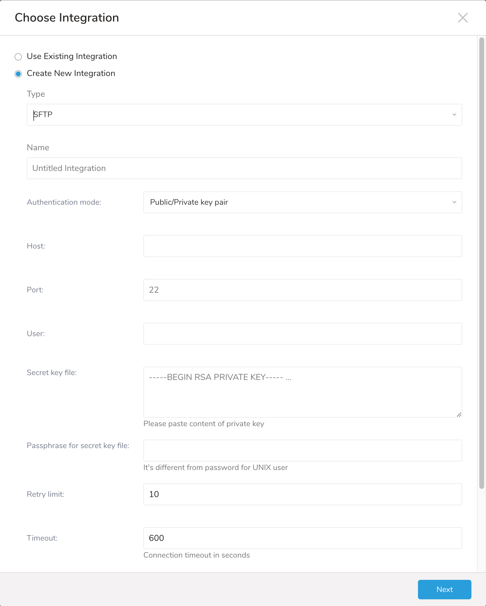 - Secret key file: Required if public / private key pair is selected as Authentication Mode. (Note that the key type Ed25519 is not supported but the DSA/RSA/ECDSA key types are supported.)