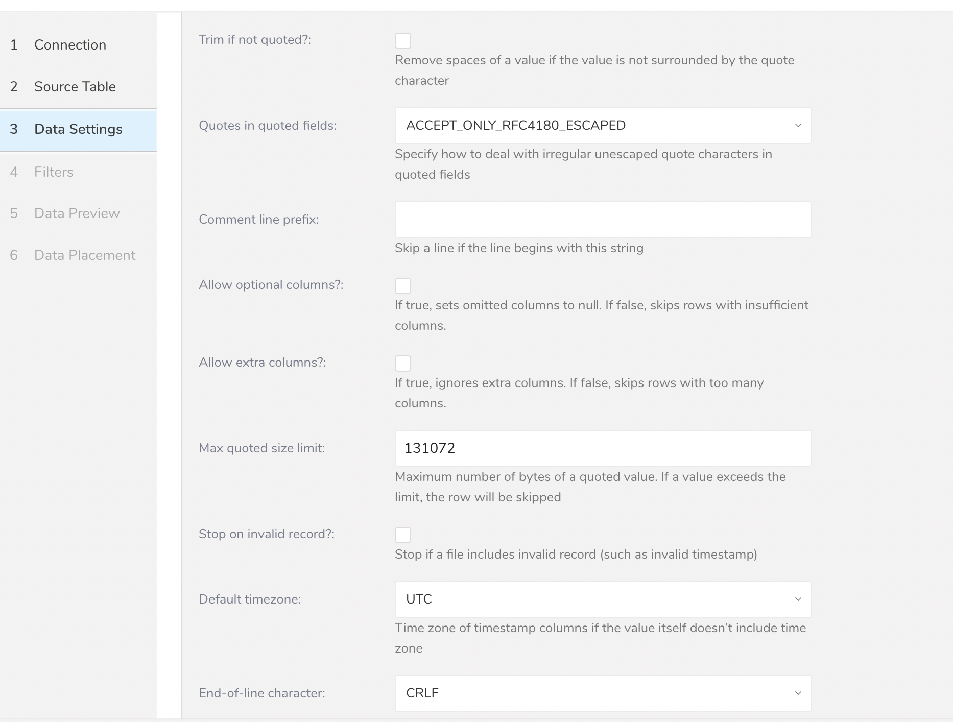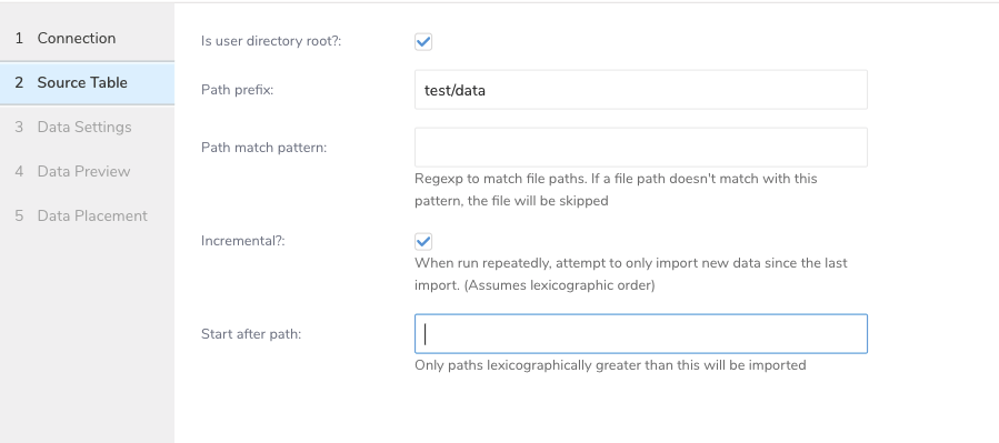 | Path match pattern | Type a regular expression to query file paths. If a file path doesn't match the specified pattern, the file is skipped. For example, if you specify the pattern .csv$, then a file is skipped if its path doesn't match the pattern. |