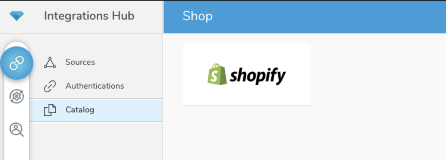 - Go to Integrations Hub > Catalog and search and select Shopify.