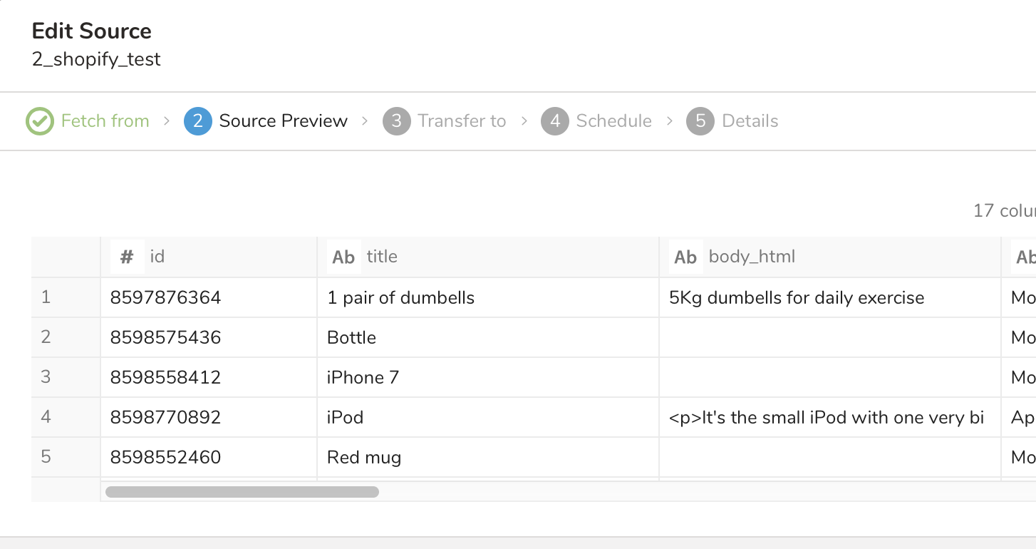 | Source | The type of object that you want to transfer from Shopify such as products, customers, transactions, orders, inventory, and metafields. The following list identifies supported elements: - Objects - inventory level - inventory_items - location - Order status - open - closed - canceled - any - Metafields resource - product - customer - order - online_store - shop - Product resource objects - product - product_variant - product_image - collection - Order resource objects - order - draft_order - Online_store resource objects - blog - article - page |