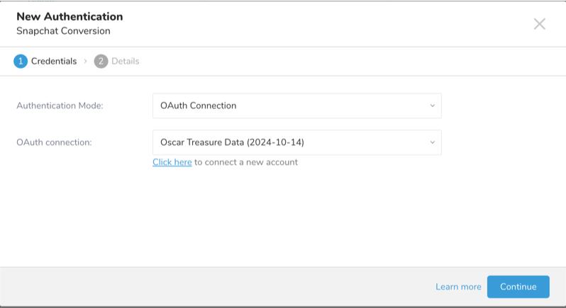 - Select an existing Snapchat CAPI authentication or create a new one described previously