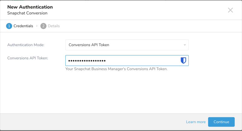 Parameter Description Authentication Mode Authentication method. Supported values: - oAuth Connection: OAuth Authentication - Conversions API Token: Long live access token generated in the Snapchat Business Manager. Conversions API Token You can obtain the Conversions API Token from the Snapchat Business Manager. This parameter is only available for Conversion API Token authentication methods.