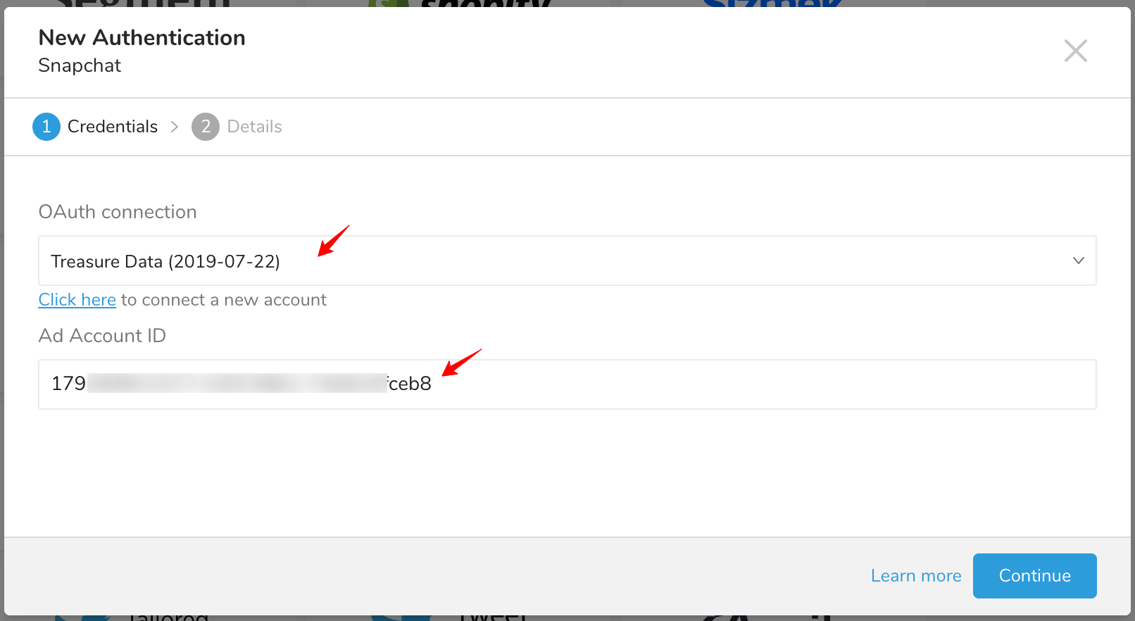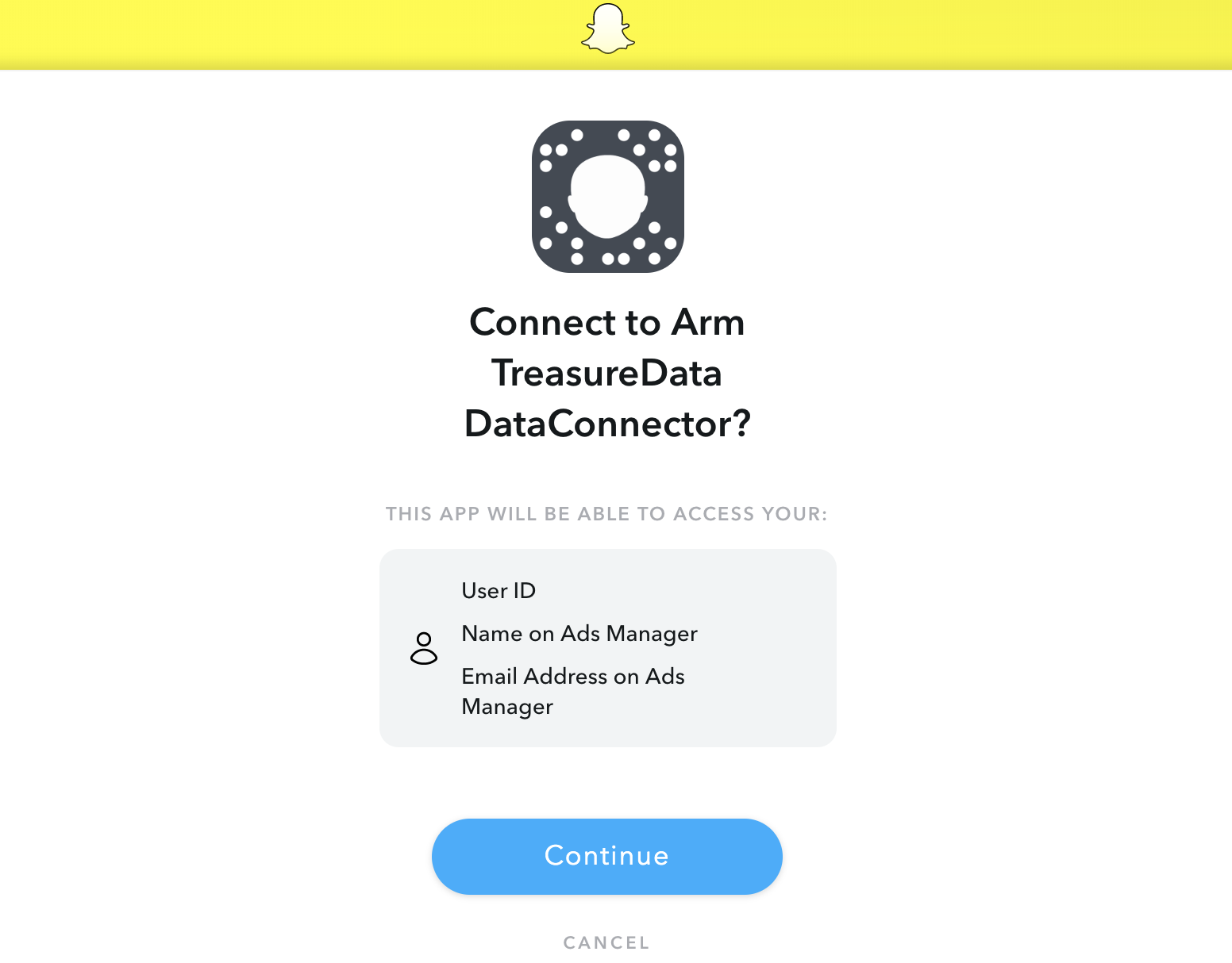 - Authorized Treasure Data account access to Snapchat Marketing account