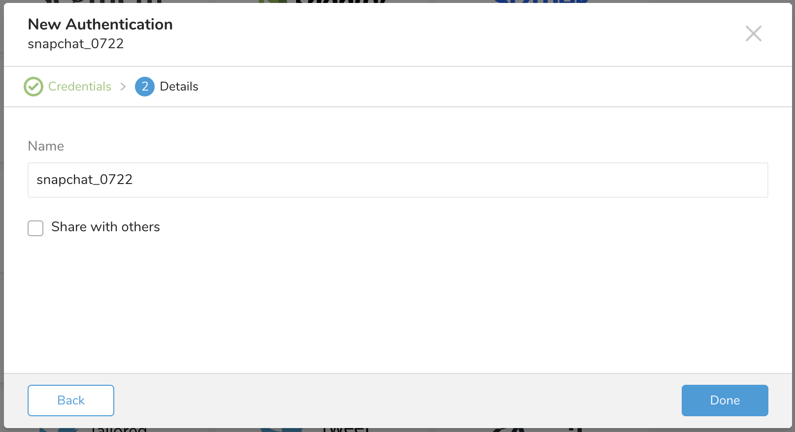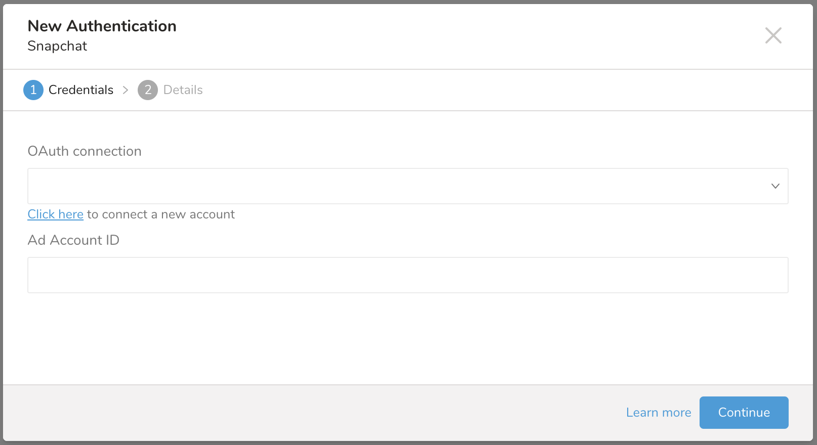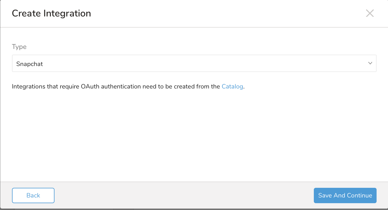 Create a new Snapchat Connection. Select New Integration, and select Snapchat from the Type dropdown. You see the following: