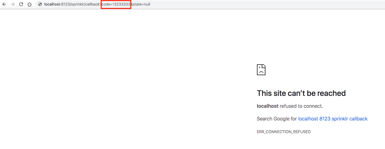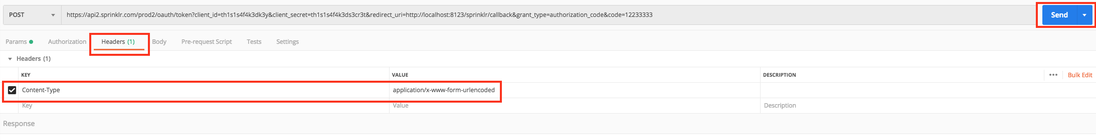 https://api2.sprinklr.com/prod2/oauth/token?client_id=th1s1s4f4k3dk3y&client_secret=th1s1s4f4k3ds3cr3t&redirect_uri=http://localhost:8123/sprinklr/callback&grant_type=authorization_code&code=12233333Change the method to POST.